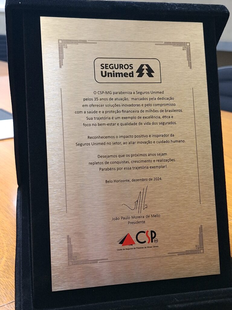 “O CSP-MG parabeniza a Seguros Unimed pelos 35 anos de atuação, marcados pela dedicação em oferecer soluções inovadoras e por seu compromisso com a saúde e a proteção financeira de milhões de brasileiros. Sua trajetória é marcada pela excelência no atendimento, pela ética e pela busca constante por promover o bem-estar e a qualidade de vida de seus segurados. Reconhecemos o impacto positivo que a Seguros Unimed tem gerado no mercado, especialmente ao aliar inovação, sustentabilidade e cuidado humano. Desejamos que os próximos anos sejam repletos de conquistas, crescimento e realizações!”