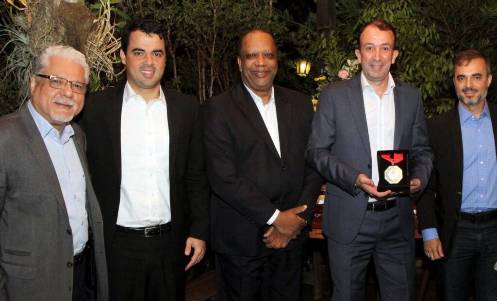 Personalidade agraciadas com a Medalha do Mérito Segurador entregue pelo presidente do SindSeg, Marco Neves (ao centro): Gabriel Ivo, representando o homenageado José Horta Bregunci, Jamir Pereira dos Santos, Joaquim Fonseca e Rogério Araújo