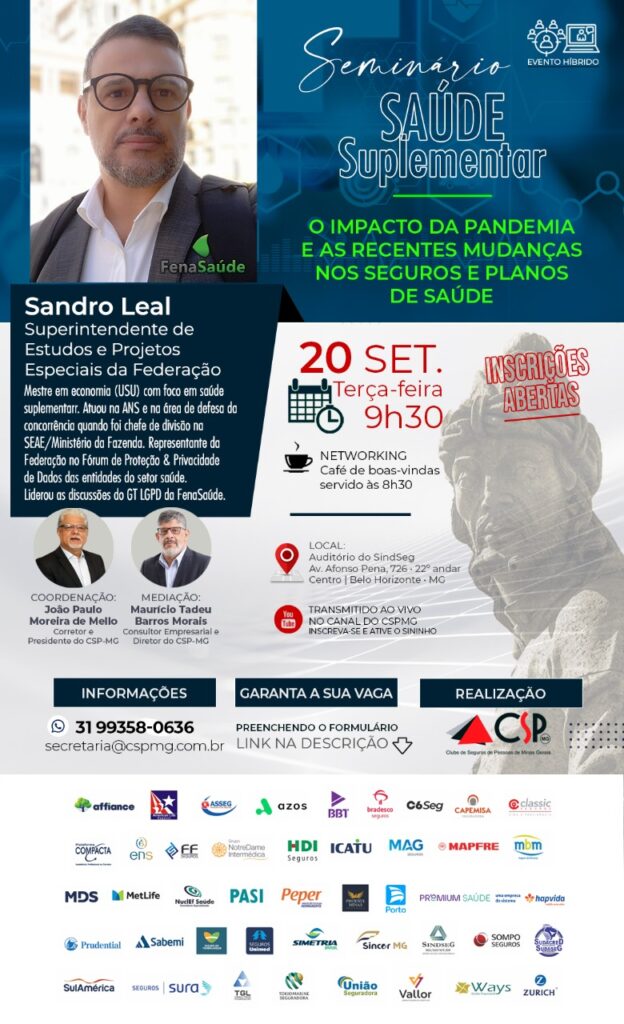 “O impacto da pandemia e as recentes mudanças nos seguros e planos de saúde”. Esse é o tema do Seminário Saúde Suplementar que o Clube de Seguros de Minas Gerais (CSP-MG) realiza no dia 20 de setembro, às 9h30, com palestra do superintendente de Estudos e Projetos Especiais da FenaSaúde, Sandro Leal.